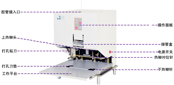 NB-2250 [工作方式] 电动打孔 电动装订 [装订形式] 胶管或塑管 [打孔厚度] 50MM [装订厚度] 50MM [打孔直径] 7MM [装订方式] 高压尼龙管加热高温压铆 [工作速度] 打孔:约11秒/次 装订: 约10秒/次 [工作平台尺寸] 380×455mm [预热时间] 约4-6分钟 [打孔孔径] 7mm [消耗功率] 300W [机器尺寸] 390×540×535mm [机器重量] 63.5 kg |